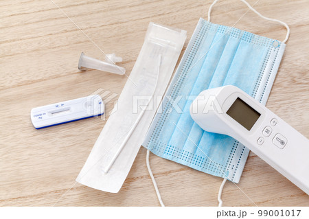 コロナ自主検査の抗原検査キットと体温計、マスク