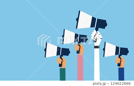 メガホンを抱えるいろいろな腕のフラットイラスト、ベクター