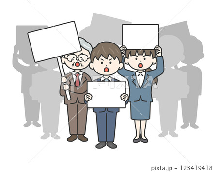 プラカードを持って、抗議デモをおこなう、労働者達(線画)のイラスト