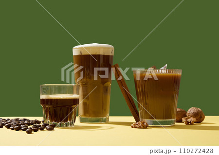 Different delicious cups of coffee with creamy foam decorated on a green background with coffee beans, cinnamon sticks and walnuts. A cup of coffee in the morning helps you feel more alert and active
