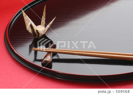 お膳と箸 お盆・赤 1 ツル・扇子の影入り