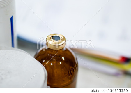Coronavirus vaccine. Ampoule with COVID-19 medicine on a white table with medical equipment and capsules in packs. Close-up. Development and use of a cure for a new virus