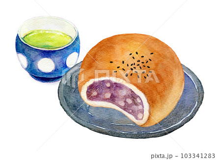 お茶と和菓子のセット あんぱん 水彩イラスト