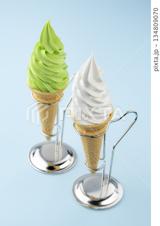 水色背景に並ぶ抹茶ソフトクリームとバニラソフトクリームコーン二つと金属スタンド