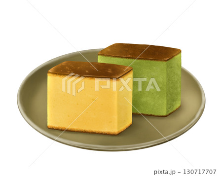 お皿にのった長崎カステラ、抹茶カステライラスト