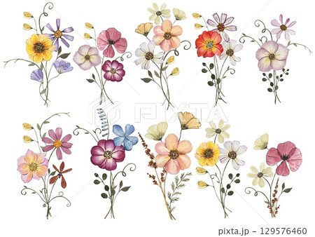 Collection with pressed dry flower bouquets isolated on white background. Watercolor illustration
