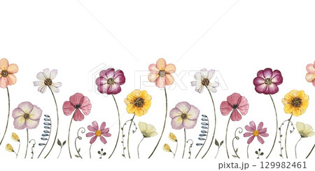 Floral seamless pattern with dried pressed flowers. Watercolor on white background