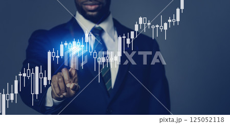 金融チャートを指さす男性ビジネスパーソン バナー・広告向け横長ビジュアル