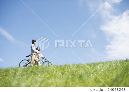 草原で自転車を押すカップル