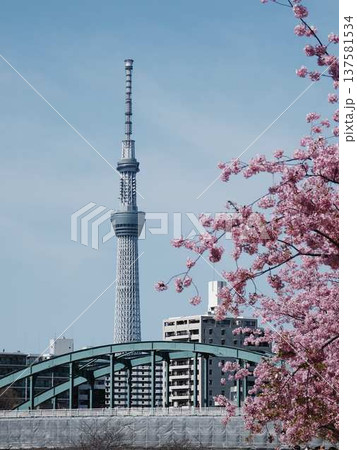 日本の東京都市景観 青空に映える東京スカイツリーと御殿場桜などを望む=4月