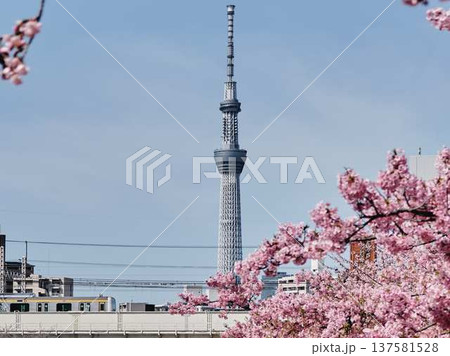 日本の東京都市景観 青空に映える東京スカイツリーと御殿場桜などを望む
