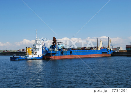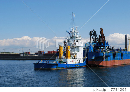 港の風景 停泊する作業工事用船舶(起重機船と曳舟)