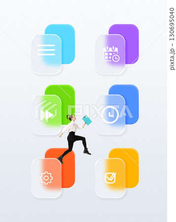 Businesswoman jumping across colorful digital app icons in futuristic workplace collage