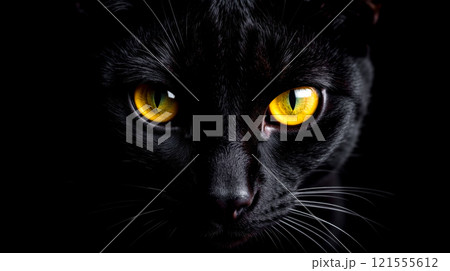 Portrait of black cat with piercing yellow eyes staring into camera, dark backdrop, symbolic animal, enigmatic look, feline charm, mystical, nocturnal creature, close-up