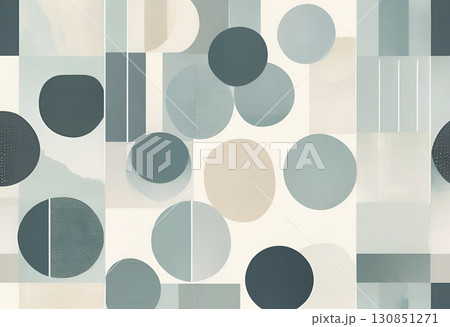 Abstract geometric shapes and circles in muted blue grey and beige tones create a modern minimalist background
