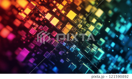 虹色に輝くデジタルキューブがランダムに空間に並ぶイメージをリアルに描いたAI生成画像