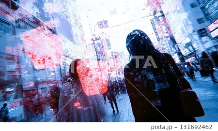 Distorted Urban Scene with Silhouetted Figures and Abstracted Ci