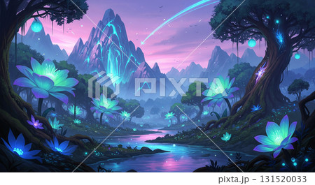 Thai style wallpaper, Mangrove roots stretch infinitely in surreal fractal pattern illuminated by blue and pink light, creating mysterious and enchanting tropical forest atmosphere