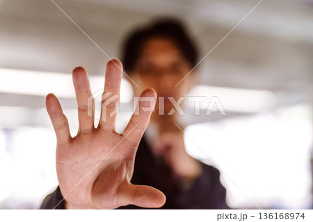 スマートフォンで話しながらバツ印を出すビジネスマン
