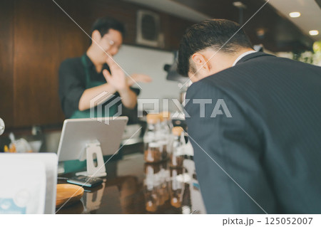 立って打ち合わせ_相手をバカにしたように話すビジネスマン_1