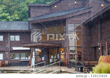 雨に練れた公共施設の風景
