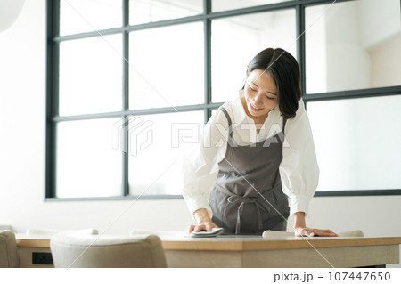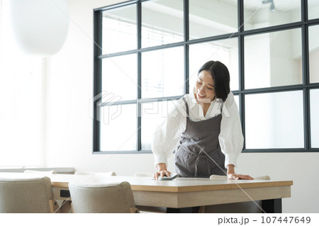 テーブルの上を拭く女性の写真