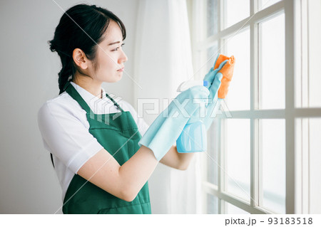布巾で部屋の窓を拭く女性