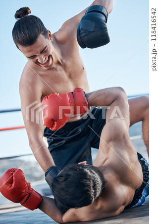Floor, boxing ring or angry man fighting in sports exercise, workout or match competition in city outside. Ground punch, boxers or fighters fighting in fitness workout or mma battle for self defense