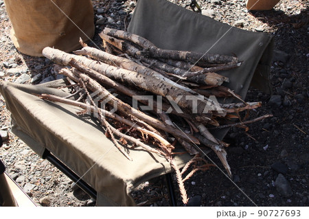 焚き火のために拾ってきた枯れ枝の薪