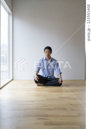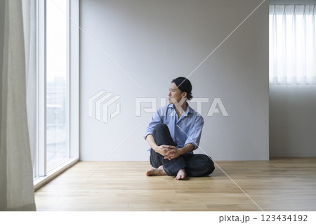フローリングの床に座るアラフォーの男性 カメラ目線