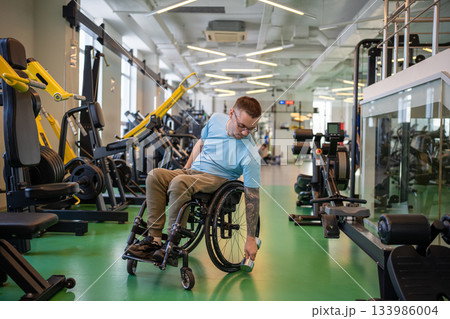 Disabled man in wheelchair building upper body and arms strength with dumbbells at training in gym.