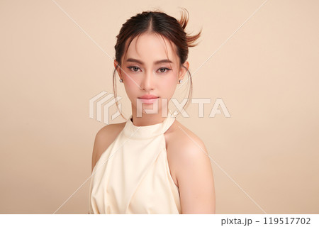 Beautiful young asian woman with clean fresh skin on beige background, Face care, Facial treatment, Cosmetology, beauty and spa, Asian women portrait.