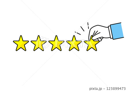 5つ星評価で5つ目の星を掴むスーツを着た人物の手のイラスト