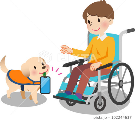 車椅子の男性にスマホを持ってくる介助犬