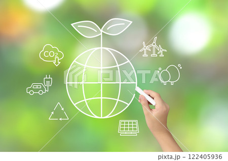 Hand protect globe on green nature background with icon Environmental, renewable, sustainable energy, CO2, net zero, recycle, ESG concept for low, neutral carbon. Ecology and Environment day concept