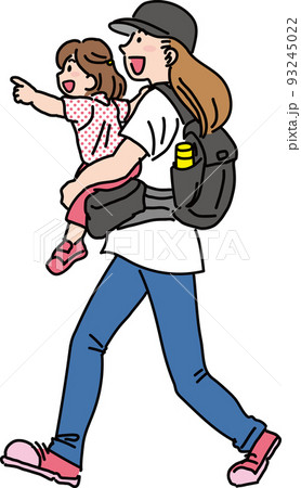 夏服の親子_前を指裂く女の子を抱っこして歩くママ