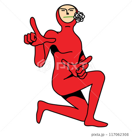 ひざまずいて指を刺す全身タイツの人