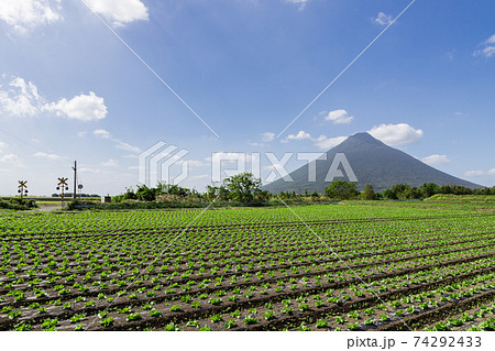 さつま芋畑の彼方にそびえる開聞岳(薩摩富士)