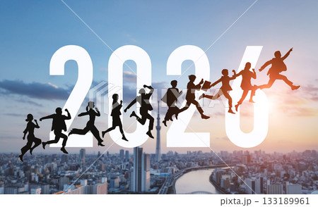 都市を背景にジャンプする人々 2026年新年イメージ ビジネス向け年賀状素材