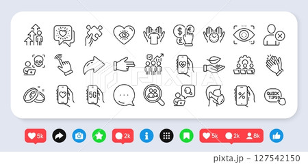Friends chat, Teamwork and Hold t-shirt line icons pack. Social media: share, comment, like icons. Clapping hands, Business statistics, Wedding rings web icon. Vector