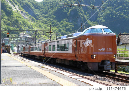 新緑の伯備線特急やくも号:381系電車(国鉄色リバイバル編成)