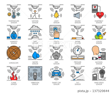 Smart control sensor color line icons of IoT electronics technology, vector pictograms. Pressure and gas sensor icons, alcohol tester, vibration, temperature or light sensor, motion or sound detector