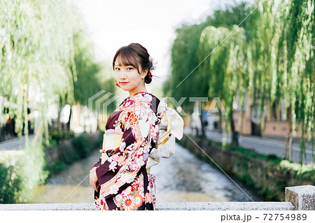 ふたりの着物女性 着物姿の外国人と日本人 着物で京都観光 白川と京都の街並み イメージ素材