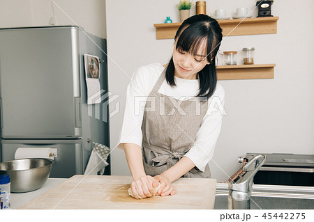 パン作り 生地をこねる若い主婦 日本人女性