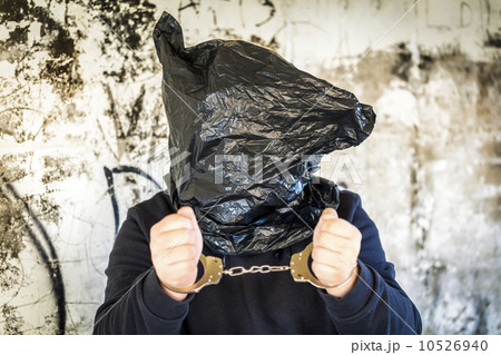 Hostage in handcuffs and with a bag on head near wall