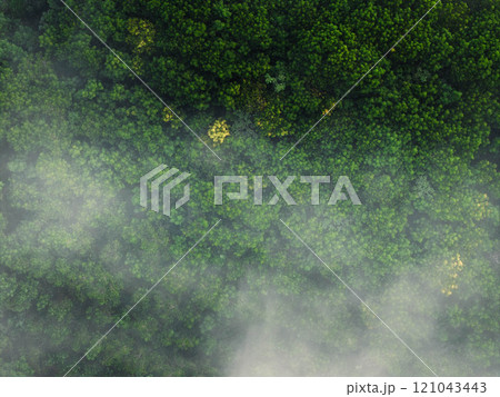 Aerial view of trees and morning fog.
