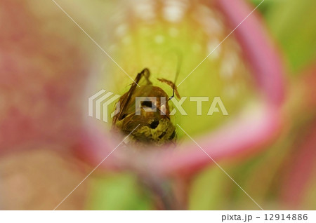 食虫植物・サラセニアの捕虫器の底に落ちた虫・縦位置