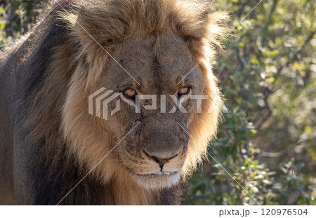 Majestic lion resting on snowy ground exhibits strength and calm against winter landscape, AI Generative