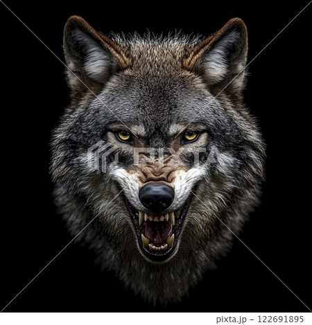 黒背景に浮かぶ威嚇する狼の顔「AI生成画像」