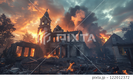 Community Church Among Other Structures In Ruins From Devastating Fire. Generative AI.